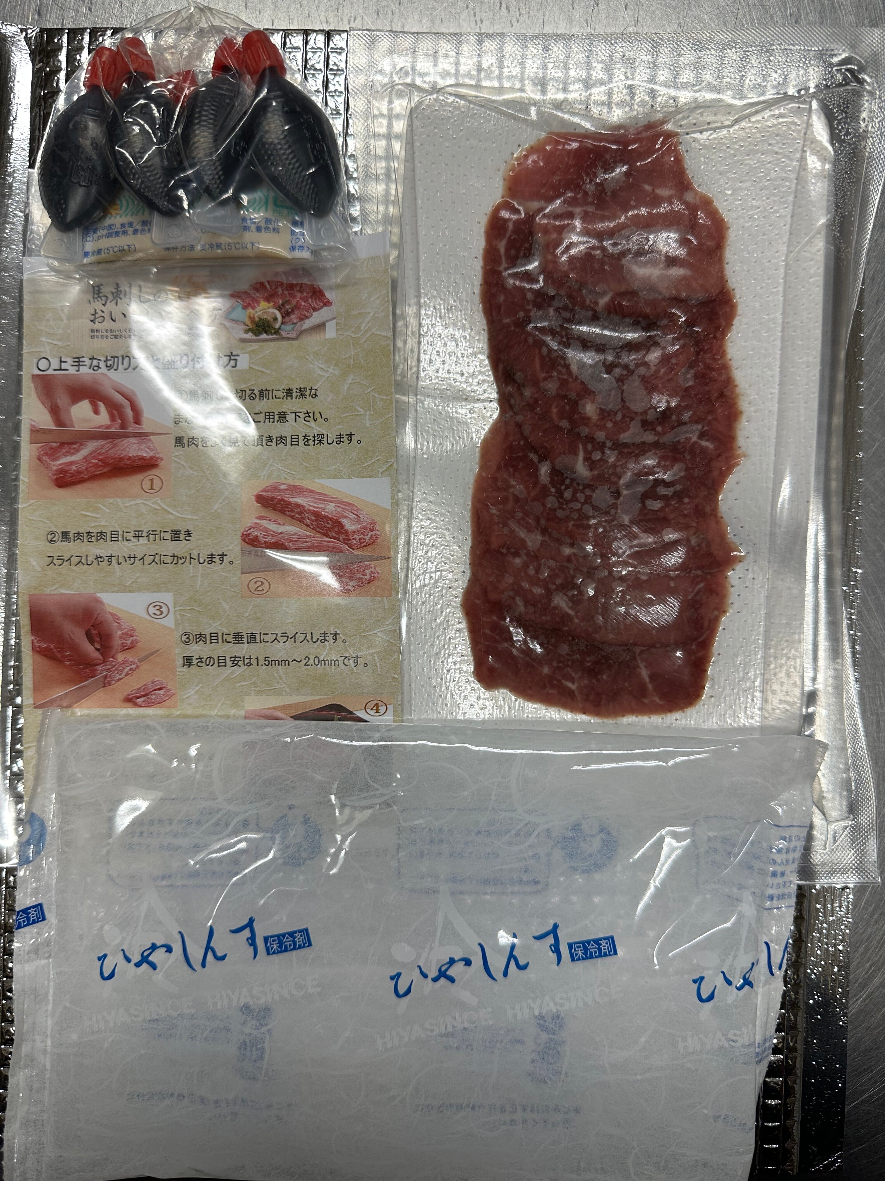 馬刺し霜降りスライス40g / 添付生姜醤油 / 保存方法、調理説明書